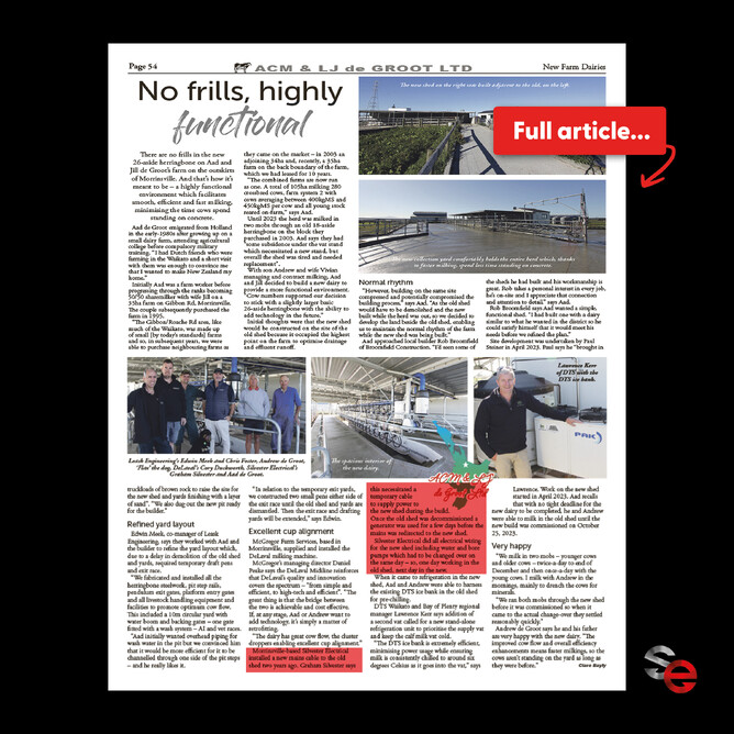 There are no frills in the new 26-aside herringbone on Asd and Jill de Groot’s farm on the outskirts of Morrinsville. And that's how it's meant to be, are highly functional environment which facilitates smooth, efficient and fast milking, minimalizing the time cows spend standing on concrete.